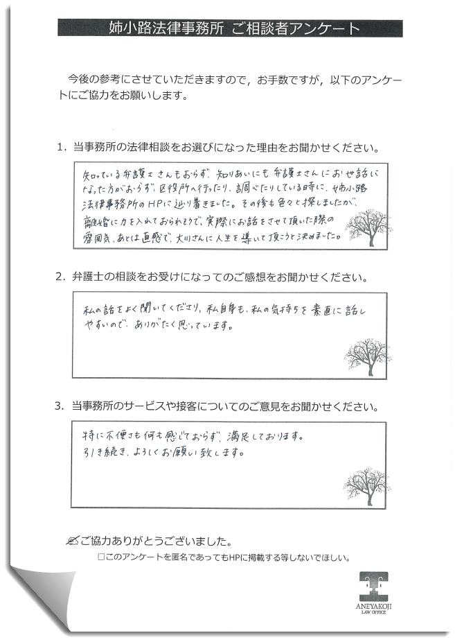 姉小路法律事務所は,離婚,慰謝料,相続・遺言などの家族関係・親族関係の紛争(家事事件)に力を入れている京都の法律事務所です。なかでも離婚・慰謝料事件は,年間300件以上の相談をお受けしており,弁護士代理人として常時数十件の案件を取り扱っております。弁護士に相談するのはハードルが高いとお考えの方も多いかもしれませんが、まずはお気軽にお問い合わせ下さい。男性弁護士・女性弁護士の指名もお伺いできますのでお申し付けください。 |弁護士紹介はこちら